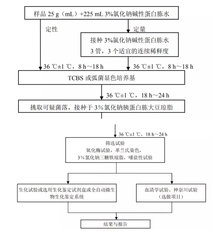 國(guó)標(biāo)(GB 4789.7-2013)中描述了對(duì)食品中副溶血性弧菌做定性/定量檢測(cè)的方法。該方法采用3%氯化鈉堿性蛋白胨水增菌液進(jìn)行增菌后、接種于TCBS 或弧菌顯色培養(yǎng)基使包括副溶血性弧菌在內(nèi)的嗜鹽性弧菌得以分離,可疑菌落經(jīng)氧化酶試驗(yàn)、3%氯化鈉三糖鐵斜面、革蘭氏染色和嗜鹽性實(shí)驗(yàn)進(jìn)行初步判定,最后可選擇生化、鑒定試劑盒或全自動(dòng)微生物生化鑒定系統(tǒng)進(jìn)行確定其是否為副溶血性弧菌。